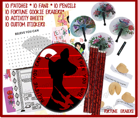 Included in the Believe you can and then you will (KIT FOR 1)(1) Believe you can patches (1) Metallic or holographic Pencils (1) Fortune cookie Erasers (1) Movie inspired custom stickers (1) Floral fans (2) Activity sheets (themed to the patch)