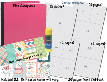 Pages can store photos, tickets, memorabilia, 3x4 cards with sayings, artwork and much more. Check out our packs of small die cuts you can also add to the pages and to the front cover of your book.Only $2.49 each pack!REFILLS AVAILABLE--Album holds up to 50 pages SIZES OF PAGES INSIDE (3) 6"X8" inch pages (front and back 6 pages total) (3) 4"X6" (front and back 6 pages total) (easy for sliding in 4x6 photos) (2) 3"X4" pockets at the top and 4"X6" pocket at the bottom of page (4 total-front and back) (2) 3"X4" pocket pages (4 pockets on each page to fit cards included or cut photos) It easy to create collages on Walgreens, Walmart, or other sites on a 4x6 space. Simply cut them in half and place them in the pockets for quick memories on a page. Acid and lignin free. Comes in a variety of colors.