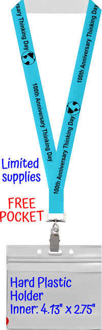 Thinking Day Lanyard: [Alligator clip] This DOES INCLUDE the FREE plastic Pocket holder for passport or patches. Description: 5/8" Ribbon Lanyard Lanyard Color: aqua Attachment: Alligator Clip black (Imprint): 100th Anniversary THINKING DAY